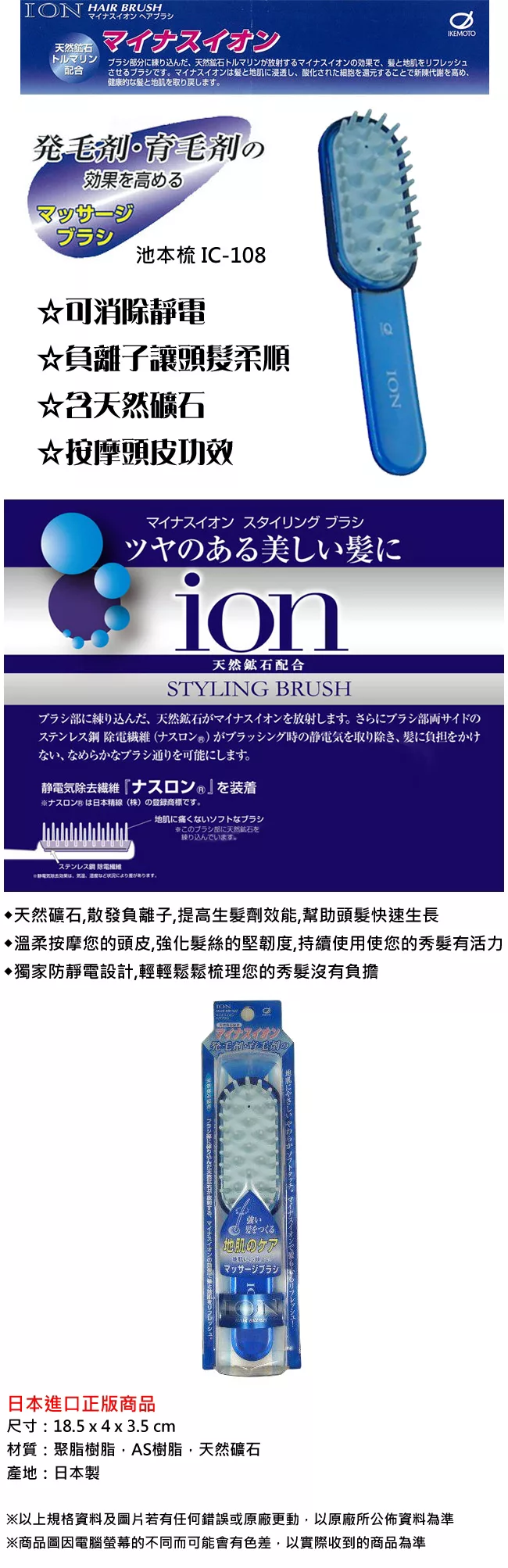 【日本進口】IKEMOTO 池本 負離子 ion天然礦石 按摩梳 美髮梳 池本梳 消除靜電 IC-108![]()