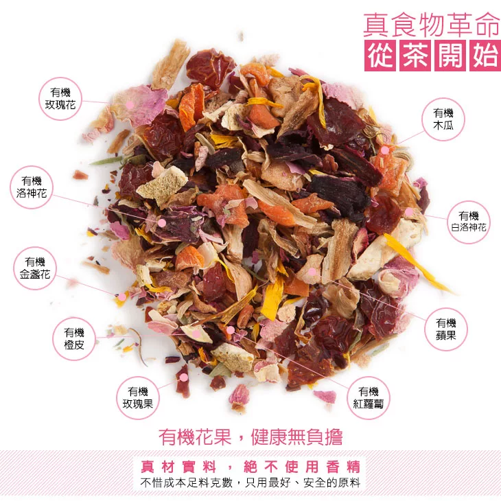 原料:有機玫瑰果、有機洛神花、有機白洛神花、有機紅蘿蔔、有機蘋果、有機橙皮、有機玫瑰花、有機木瓜(有機木瓜、有機米粉)、有機金盞花